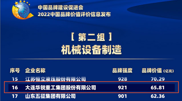 大連重工品牌價(jià)值位列機(jī)械制造類企業(yè)第16位