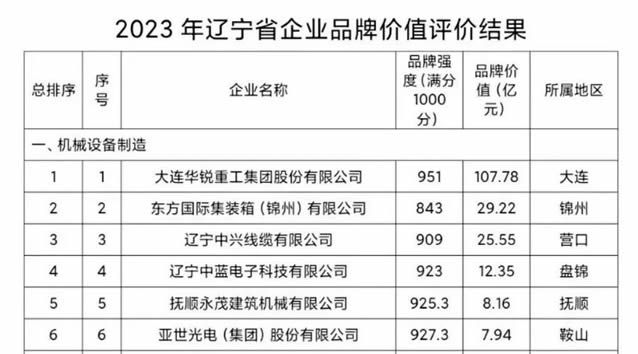 近日,遼寧省品牌建設(shè)促進(jìn)會(huì)聯(lián)合遼寧廣播電視臺(tái)發(fā)布了2023年度遼寧省品牌價(jià)值評(píng)價(jià)信息,評(píng)價(jià)結(jié)果顯示,大連重工以951分(滿分1000分)的品牌強(qiáng)度、107.78億元的品牌價(jià)值,位居機(jī)械設(shè)備制造企業(yè)榜第一位。