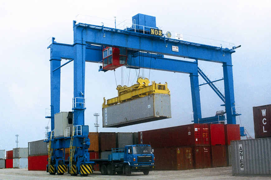 輪胎式集裝箱門式起重機(jī)方面,大連重工研制的該類產(chǎn)品適用于國際標(biāo)準(zhǔn)集裝箱的搬運(yùn)及裝卸,設(shè)備性能先進(jìn),機(jī)動(dòng)性好,對(duì)地面不平度敏感性小。目前產(chǎn)品主要機(jī)型為吊具下30.5噸—45噸。