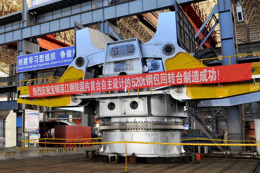 大包轉(zhuǎn)臺安裝在連鑄車間鋼水接受跨和連鑄跨之間的澆鑄平臺上,用于接受煉鋼系統(tǒng)送來的盛滿鋼水的鋼包,將鋼包轉(zhuǎn)至連鑄跨的澆注位置進(jìn)行澆注。大連重工研制的大包轉(zhuǎn)臺產(chǎn)品單臂承載能力從42噸到520噸,尤其是大噸位(大于200噸)鋼包回轉(zhuǎn)臺國內(nèi)市場占有率很高,產(chǎn)品功能從單一回轉(zhuǎn)型發(fā)展到多功能型。